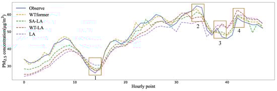 The ablation model was established by removing some modules in the hybrid model. Its experimental purpose was to ensure that the introduction of each module in the model was effective for improving the prediction accuracy. Self-Attention LSTM Attention (SA-LA), Wavelet Transform LSTM Attention (WT-LA) and LSTM-Attention (LA) were constructed for ablation experiments. Among them, the SA-LA was constructed by removing the wavelet decomposition module, the WT-LA was constructed by removing the feature enhancement module, and the LA model was constructed by removing the wavelet decomposition and feature enhancement modules. With the same number of training rounds and learning rate, the concentration of PM2.5 in the next 48 h was predicted by WTformer and the three ablation models. The predicted and observed values are shown in Figure 11. By analyzing the performance of each model at markers 1, 2, 3, 4, it can be found that the WTformer model performs best, whereas the SA-LA and LA models, which lacked the wavelet decomposition module, were less sensitive to the mutation. The WT-LA and LA models, which lacked the feature enhancement encoder, had a prediction lag problem at markers 1 and 3.