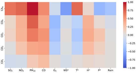 We conducted a correlation analysis to determine the influence of meteorological and pollutant parameters on PM2.5 at a deeper level to show the interpretability of the model. To analyze the factors affecting the variation in PM2.5 for different frequency bands, Figure 12 shows the attention matrix learned by self-attention in the encoder. Among the pollutant factors, the correlation between PM2.5 and PM10/NO2/CO/SO2 was reflected mainly in the low-frequency band and slower frequency band in the high-frequency band, and the correlation was lower in the high-frequency band. The correlation between PM2.5 and O3 was reflected mainly in the slower high-frequency band, and the correlation was lower in the low-frequency band and the faster high-frequency band. Among meteorological factors, the correlation between PM2.5 and temperature/wind speed/pressure/precipitation were reflected mainly in the low-frequency band, and the correlation was weak in the high-frequency band. The correlation between PM2.5 and humidity was reflected mainly in the slower high-frequency band, and the correlation was weak in the low-frequency band.