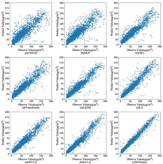 To show the prediction effect more intuitively, Figure 13 compares the predicted and observed values of PM2.5 concentration predicted by WTformer with five baseline models and three ablation models at a time step of 4h. The prediction curves for each model were basically consistent with the observation curves, and there was a linear correlation. Compared with the time-series prediction models LSTM and GRU, there was a greater difference between the predicted and observed values of the non-time-series prediction models MLP and CNN1D, which indicates that capturing time dependence in time-series prediction helps to improve the prediction ability of the models. Transformer captures time dependence by embedding position coding, which had similar performance to LSTM and GRU when the predicted time step is 4. The ablation models could not predict some mutation values and extreme values, and the prediction performance was not as good as WTformer. Compared with the previous models, the WTformer model had the best prediction effect in each stage. The main reasons are that the WTformer model obtains richer time–frequency domain information, exhibits more sensitivity to local changes and improves the prediction accuracy by reducing the influence of noise signals.