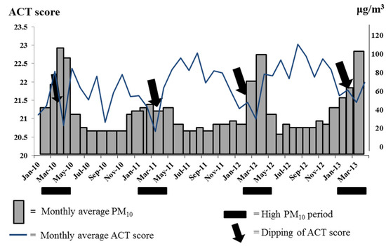 Achievement and maintenance of asthma control is the goal of asthma care [20], and ACT is an easy and useful tool for assessing asthma control [21]. A subjective self-assessment of patients suffering from asthma, including asthma symptoms (daytime and nocturnal), the use of rescue medications, the asthma-related limitation of activity, and the patient’s perception of asthma control has a great benefit in the long-term evaluation of disease control. The significant difference in ACT scores during the high and low PM10 period confirmed that this tool was beneficial in the demonstration of worsening asthma control during high pollution season.