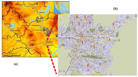 (a) Location of Kozani city in the wider area of Western Macedonia (grey areas: lignite open mines; black points: power plants (5)). (b) Map of Kozani city with the locations of the 26 participating households (highlighted by red arrows).