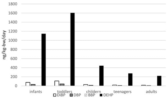 where Cdust is the mean concentration of each phthalate ester in the dust (μg/g), f1 is the time fraction a person spends indoors a day (indoor exposure factor), f2 is the dust ingestion rate (g/day) and M is body weight (kg). Because of the differences in the body weight and dust ingestion rates of humans, the DI rate is calculated for five age groups: infants (<1 yr), toddlers (1–3 yr), children (4–10 yr), teenagers (11–18 yr) and adults (≥19 yr). The average body weight for each age group was taken as 5, 16, 29, 52 and 65 kg. The estimated DIs of phthalate esters through dust ingestion in Kozani city are illustrated in Figure 2. The total DI of measured phthalates via dust ingestion range from 243 ng/kg-bw/day for adults to 1766 ng/kg-bw/day for toddlers. The estimated daily intake of phthalate esters was higher for toddlers than for the other age groups. This trend is also similar to the findings obtained in the study conducted by Albar et al. []. Toddlers are at high exposure risk due to lower body weights and higher dust intake because of frequent hand-to-mouth activities and intensive contact with dust during crawling. However, due to the small number of samples, it should be pointed out that the daily intake of phthalates is an indication of the likely range for the population in this study area. Compared with other studies, the estimated DIs for DEHP for children in Kozani (443–1605 ng/kg-bw/day) are in good agreement with those in the USA (400–1500 ng/kg-bw/day) [] and slightly higher in the case of Denmark’s (~1000 ng/kg-bw/day) []. The comparison between the DI rate for DEHP and DBP found in this study and the reference dose (RfD) recommended by the United State Environmental Protection Agency (U.S.EPA) (20 μg/kg-bw/day for DEHP and 100 μg/kg-bw/day for DBP [,] reveal that the values are far below the reference levels.