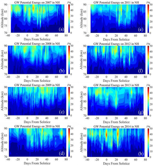 The GW potential energy distribution in the NH PMC seasons from 2007 to 2014. (a) GW potential energy on 2007 PMC season; (b) GW potential energy on 2008 PMC season; (c) GW potential energy on 2009 PMC season; (d) GW potential energy on 2010 PMC season; (e) GW potential energy on 2011 PMC season; (f) GW potential energy on 2012 PMC season; (g) GW potential energy on 2013 PMC season; (h) GW potential energy on 2014 PMC season.
