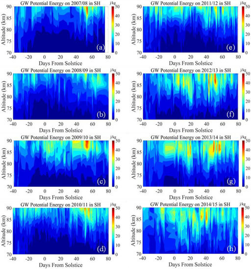 The GW potential energy distribution in the SH PMC seasons from 2007/2008 to 2014/2015. (a) GW potential energy on 2007/2008 PMC season; (b) GW potential energy on 2008/2009 PMC season; (c) GW potential energy on 2009/2010 PMC season; (d) GW potential energy on 2010/2011 PMC season; (e) GW potential energy on 2011/2012 PMC season; (f) GW potential energy on 2012/2013 PMC season; (g) GW potential energy on 2013/2014 PMC season; (h) GW potential energy on 2014/2015 PMC season.