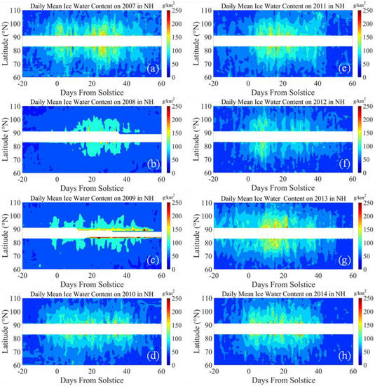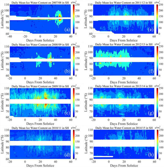 The distribution of daily averaged IWC during the PMC seasons from 2007/2008 to 2014/2015 in SH. (a) IWC on 2007/2008 PMC season; (b) IWC on 2008/2009 PMC season; (c) IWC on 2009/2010 PMC season; (d) IWC on 2010/2011 PMC season; (e) IWC on 2011/2012 PMC season; (f) IWC on 2012/2013 PMC season; (g) IWC on 2013/2014 PMC season; (h) IWC on 2014/2015 PMC season.