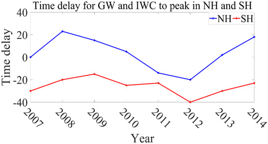 The time delay of the peak time for GW and IWC on each PMC season in NH (blue line) and SH (red line). In 6/8 seasons of NH, when the GW activity reached its peak value, the IWC would increase and peak within 0–23 days. Yet in all 8 seasons of SH, the IWC started to increase ahead of GW activity.