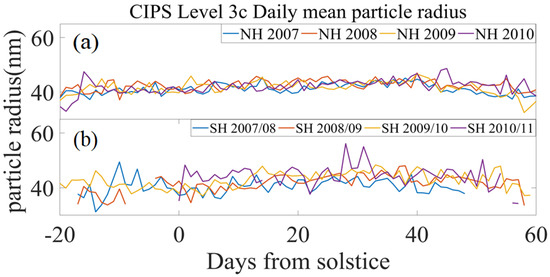 In addition, the PMC ice particle radius also shows the difference between the NH and SH. A comparison of the radius distributions for the PMC seasons from 2007 to 2010 in the NH and 2007/2008 to 2010/2011 in the SH is shown in the following result. Figure 6a shows the daily average of the particle radius for the NH, and 6b shows the daily average radius for the SH. It can be found that in the SH seasons, the variation in particle size was significantly larger than that in the NH. The maximum particle radius in the SH could reach 56.08 nm in 2010/2011, with a variation amplitude of 21.81 nm during the same season. In the NH, the particle radius peaked at 52.97 nm in 2013, and the largest difference in particle size between seasons was 17 nm. Compared with the distribution of GW activity in the NH and SH from Figure 1 and Figure 2, it can be seen that the variation of GW activity was small during the PMC seasons in the NH. The result indicates that under the inactive action of GW, the particle radius in the NH changed only very slightly. In contrast, the variation of GW activity in the SH was more obvious, which might have some influence on the particle size variations.