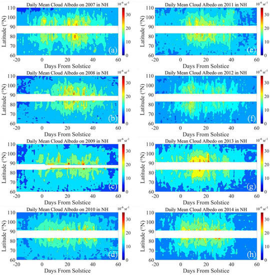The cloud albedo distributions of the PMC seasons from 2007 to 2014 in the NH. (a) Cloud albedo on 2007 PMC season; (b) Cloud albedo on 2008 PMC season; (c) Cloud albedo on 2009 PMC season; (d) Cloud albedo on 2010 PMC season; (e) Cloud albedo on 2011 PMC season; (f) Cloud albedo on 2012 PMC season; (g) Cloud albedo on 2013 PMC season; (h) Cloud albedo on 2014 PMC season.