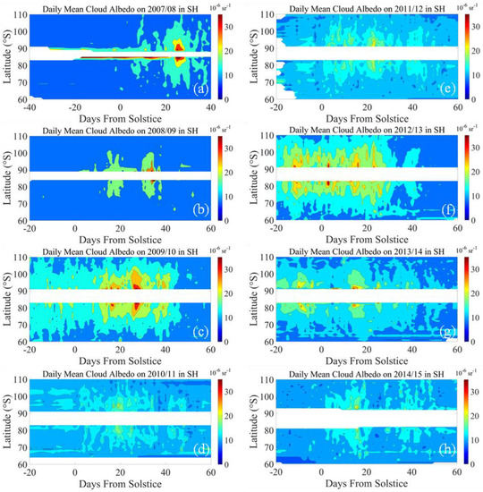 The cloud albedo distributions of the PMC seasons from 2007/2008 to 2014/2015 in the SH. (a) Cloud albedo on 2007/2008 PMC season; (b) Cloud albedo on 2008/2009 PMC season; (c) Cloud albedo on 2009/2010 PMC season; (d) Cloud albedo on 2010/2011 PMC season; (e) Cloud albedo on 2011/2012 PMC season; (f) Cloud albedo on 2012/2013 PMC season; (g) Cloud albedo on 2013/2014 PMC season; (h) Cloud albedo on 2014/2015 PMC season.