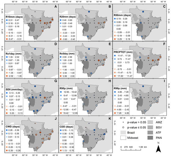 Spatial distribution of trends regarding number of heavy precipitation days (R10mm) (A), number of very heavy precipitation days (R20mm) (B), number of days above 50 mm (R50mm) (C), maximum 1-day precipitation amount (Rx1day) (D), maximum 5-day precipitation amount (Rx5day) (E), annual total wet day precipitation (PRCPTOT) (F), simple daily intensity index (SDII) (G), precipitation on very wet days (R95p) (H), precipitation on extremely wet days (R99p) (I), consecutive wet days (CWD) (J), and consecutive dry days (CDD) (K) in Midwest Brazil from 1979 to 2019. Large circles indicate statistical significance at the 5% level and small circles are not significant.