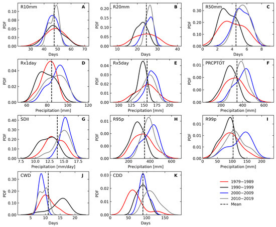 Probability Density Function (PDF) of the annual frequency of the number of heavy precipitation days (R10mm) (A), the number of very heavy precipitation days (R20mm) (B), the number of days above 50 mm (R50mm) (C), the maximum 1-day precipitation amount (Rx1day) (D), the maximum 5-day precipitation amount (Rx5day) (E), the annual total wet day precipitation (PRCPTOT) (F), the Simple Daily Intensity Index (SDII) (G), the precipitation on very wet days (R95p) (H), the precipitation on extremely wet days (R99p) (I), the Consecutive Wet Days (CWD) (J), and the Consecutive Dry Days (CDD) (K) for the Brazilian Midwest from 1979 to 2019.