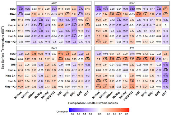 Pearson’s correlation coefficients of Sea Surface Temperature (SST) anomalies including TSAI, TNAI, ONI, Nino 1 + 2, 3, 3.4, and 4 with precipitation extreme indices in the Amazon (AMZ), Brazilian Savanna (BSV), Pantanal (PAN), and Atlantic Forest (ATF) in the Brazilian Midwest from 1979 to 2019. Cells with *** indicate p-value < 0.05.