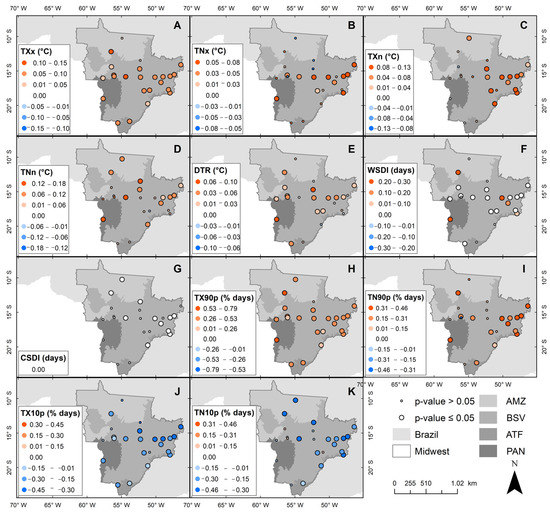 Spatial distribution of trends for Warmest Day (TXx) (A), Warmest Night (TNx) (B), Coldest Day (TXn) (C), Coldest Night (TNn) (D), Diurnal Temperature Range (DTR) (E), Warm spell duration (WSDI) (F), Cold spell duration (CSDI) (G), Warm Days (TX90p) (H), Warm Nights (TN90p) (I), Cool Days (TX10p) (J), and Cool Nights (TN10p) (K) in the Brazilian Midwest from 1979 to 2019. The bluish-colored dots refer to the range of positive trends, while the reddish-colored ones refer to that of negative trends.