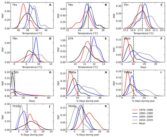 The warming trend in temperature was clear (i.e., accelerated) during the last decade (i.e., 2010–2019) compared with the long-term average of all temperature extreme indices (Figure 6). The Probability Density Functions (PDFs) indicated changes in the averages and frequency of the temperature extreme indices. The decadal mean of the TXx, TXn, TNx, and TNn increased by an average of 3.0 °C, 3.14 °C, 0.65 °C, and 4.56 °C per decade from 1979–1999 to 2000–2019 (Figure 6A–D), respectively. The cool days (TX10p) and cool nights (TN10p) decreased by an average of 6.61 days and 7.65 days from 1979–1989 to 2010–2019 (Figure 6J,K), respectively, while warm days (TX90p) and warm nights (TN90p) increased by an average of 14.79 and 11.07 days (Figure 6H,I), respectively.