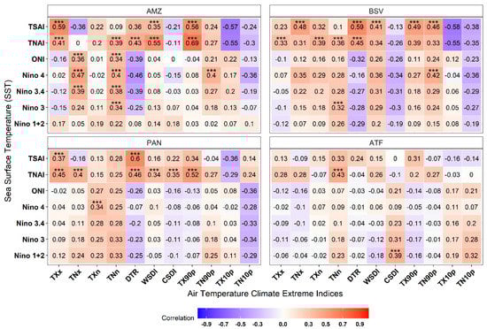 Pearson’s correlation coefficients of Sea Surface Temperature (SST) anomalies with air temperature climate extreme indices in the Amazon (AMZ), Brazilian Savanna (BSV), Pantanal (PAN), and Atlantic Forest (ATF) in the Brazilian Midwest from 1979 to 2019. Cells with *** indicate p-value < 0.05.