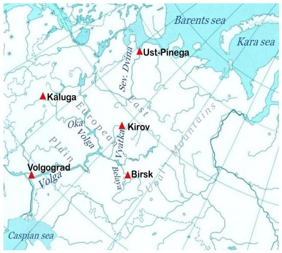 The study of humidification anomalies on the EEP in 1920–1940 is based on long-time series observational data on the changes in the annual runoff of the Severnaya Dvina river (at Ust-Pinega), as well as the Volga (Volgograd) and its tributaries, the Vyatka (Kirov), Belaya (Birsk), and Oka (Kaluga) rivers (Figure 1). Spatial averaged (20–60 E; 45–70 N) data from observational gridded archives are also examined: the monthly temperature, using HadCRUT5.0 [15] and GISTEMP v4 [16], precipitation, using CRU TS4.05 [17] and the Palmer Drought Severity Index (PDSI), using CRU-scPDSI [18].