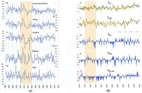 (a) Annual runoff, percent when compared with 1961–1990, for the rivers Severnaya Dvina, Volga, Vyatka, Belaya, and Oka; dotted line shows 5-year running averages. (b) Spatially averaged (20–60 E; 45–70 N) variations in the SAT anomalies, °C, 1, GISSTEMP, 2, CRUTEM, 3, ERA20C, 4, CERA20C, and precipitation; percent when compared with 1961–1990, for summer (JJA), autumn (SON), and cold period (November–April).
