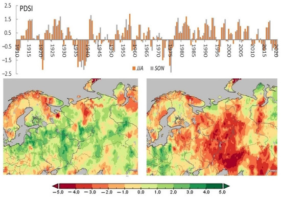The average rate of the summer (JJA) temperature rise on the EEP for 20 years was 1.4 °C. The rates of this trend are inferior to the rates of modern summer warming since the early 1990s by 0.6 °C; however, as demonstrated by the PDSI changes, the growth rates of moisture deficiency and the duration of drought on the EEP (1934–1940) have no analogue during the observation period (Figure 3). The spatial distribution of the PDSI for the four driest years on average (Figure 3) demonstrates that, in a significant part of the EEP region, especially in the Volga and Northern Dvina supply source areas, i.e., in the Kama, Vychegda, and Upper and Middle Volga basins, the index values fall below −4 (locally below −5); this indicates an extreme drought according to the Palmer classification. Yet, an even more severe extreme drought, with sustained PDSI values below −5, was observed in the north-west of Kazakhstan.
