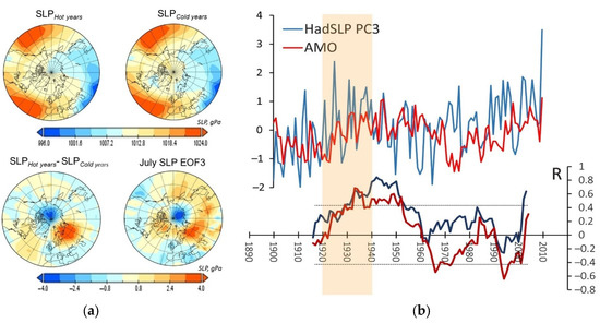 (a) Averaged SLP, gPa patterns for the years of “hot” (1931, 1936, 1938) and “cold” (1923, 1926, 1928) SAT anomalies on EEP; the difference between them and the EOF3 of SLP variability in July–August. (b) SLP PC3 and AMO(×4) (upper panel) and correlation coefficients between (blue) SLP PC3 and July–August SAT anomalies on EEP, (red) AMO and SLP PC3, calculated over 15-year running periods; horizontal dotted lines indicate the threshold level of statistically significant values (p < 0.05).