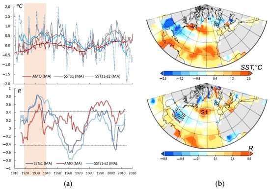 The analysis of the NA SST indicates an inhomogeneity in the spatial distribution of SST anomalies in the period of ETCW in the years of the considered SAT anomalies on the EEP, “hot” (1931, 1936, 1938) and “cold” (1923, 1926, 1928). The difference in the SST between the averages of the “hot” and “cold” anomalies for these years (Figure 5b) demonsrates two zones of positive anomalies; one is in the northwest, along the 40–55 N latitudes, and the other is in the tropical zone of the NA, divided by the belt of the opposite sign anomalies with a maximum northward of the Greater Antilles. The noted spatial pattern manifests itself already in the winter season, but the maximum values of anomalies are reached in March–April. The closest relation between the NA SST and the July SAT on the EEP during the ETCW are observed in the same months (Figure 5b). It should be noted that the spatial distribution of the centers of correlation, which are positive in the northwest of the NA (S1—20–50 W, 40–50 N) and negative northward of the Greater Antilles (S2—65–80 W, 20–30 N), corresponds to the pattern of SST anomalies considered above (Figure 5b).