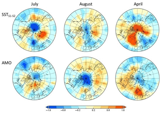 Comparing the cases of the AMO and ΔSSTS1-S2, the distribution of the regression coefficients of the NA SST in early spring (March–April) onto the SLP of the NH extratropical zone in 1920–1950 demonstrates the different degrees of their impact (Figure 6) and significant spatial differences.