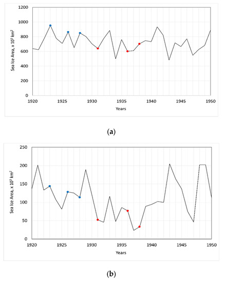 The study is based on the publicly archived datasets and generated during the previous investigations: SAT gridded datasets include observational data, HadCRUT5 (https://crudata.uea.ac.uk/cru/data/temperature/, accessed on 1 July 2022), GISSTEMP (v4 https://data.giss.nasa.gov/gistemp/), and 20th century re-analysis, ERA20C (https://apps.ecmwf.int/datasets/data/era20c), CERA-20C (https://apps.ecmwf.int/datasets/data/cera20c); precipitation data and Self-calibrating Palmer Drought Severity Index—CRU TS v4.05 (https://crudata.uea.ac.uk/cru/data/hrg/cru_ts_4.05/), scPDSI (https://crudata.uea.ac.uk/cru/data/drought/); Sea Level Pressure—HadSLP2 (https://www.metoffice.gov.uk/hadobs/hadslp2); AMO—NOAA PSL1(http://www.psl.noaa.gov/data/timeseries/AMO/); Sea Surface Temperature—HadSST.4.0.0.0 (https://www.metoffice.gov.uk/hadobs/hadsst4/). Data on the SIE in August for the Kara Sea from 1924 was obtained from the Arctic and Antarctic Research Institute database (https://nsidc.org/data/g02182/versions/1, free access). For the Barents Sea, the new reconstructed SIC data set was used (data can be sent upon request to Tatiana Aldonina (Matveeva) (matveeva.tatiana@igras.ru).