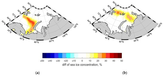 The analysis of the spatial patterns of SIC in the years of positive and negative temperature anomalies on the EEP suggests that there are spatial features. May and August were analyzed as a month of sea ice melt onset and as a month of SIE minimum, respectively. In May, the SIC increased northeastward to the Novaya Zemlya archipelago in the years of negative temperature anomaly compared to positive ones, demonstrating the greatest difference between the considered cases (Figure 8a). In August, an increase (decrease) in the SIC in the years of negative (positive) temperature anomaly was observed in the north part of both the Barents and Kara Sea (Figure 8b). The spatial features of the SIC differences indicate the influence of the warm Atlantic water inflow variability to the Barents–Kara Sea.