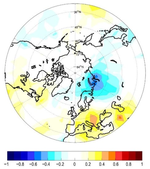 Correlation coefficients between SIA in the Barents Sea in May and SLP anomalies in July for 1924–1950.