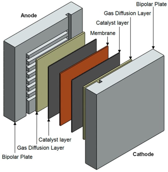 The single proton exchange membrane fuel cell is usually constructed in a hierarchical structure, with the central layer being a proton exchange membrane through which mainly protons could pass, as shown in Figure 1 [13]. From the centre to the sides are the catalyst layer (CL) of the anode and cathode, the gas diffusion layer (GDL) of two electrodes, and the bipolar plates in order. The membrane, CLs, and GDLs are also together referred to as membrane electrode assemblies (MEA), and the physical structure of these assemblies could be regarded as porous media containing multi-scale pores. The inner surface of the polar plate is mechanically machined with grooves, which are known as gas flow channels (GFCs). The area covered by the flow channels is the so-called flow field. During the operation of the cell, hydrogen and air are transported into the cell along the flow channel and reach the catalyst layer through the gas diffusion layer of anode and cathode, respectively. In the catalyst layer of the anode, the hydrogen molecules are stripped of their electrons and decomposed into protons. The electrons pass through an external circuit to form an electric current. In the catalyst layer of the cathode, the oxygen molecules react with the protons and electrons coming through the proton exchange membrane and the external circuit, respectively, resulting in water and the release of heat. After the reaction has taken place, the water produced is discharged from the cell through the gas flow channels together with the excess gas not involved in the reaction. The formulae for the electrochemical reactions occurring in the cathode and anode are listed in Table 1.