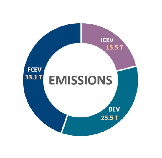 As mentioned earlier, the only products attached to the operation of a PEM fuel cell are water and heat, making it possible to call the fuel cell electric vehicles (FECVs) emission-free. However, it does not mean that the use of the fuel cell as a power source for vehicles has no negative effect on the environment. A comparison of air pollution emissions from the petrol and hydrogen-fueled fuel cell vehicles showed that emissions from hydrogen fuel cell vehicles are significantly influenced by the purity of the fuel, in particular, impurities in the hydrogen fuel should be limited to 300 mol/mol for non-hydrogen, 0.2 mol/mol for CO, and 0.004 mol/mol for sulphur compounds [27]. In addition, the current processes of the production, transport, and refuelling of hydrogen are accompanied by emissions. These emissions are more significant for hydrogen than that for petrol and diesel. Figure 2 displays emissions in tonnes from the production of fuel and vehicles for battery electric vehicles (BEVs), fuel cell electric vehicles (FCEVs), and internal combustion vehicles (ICEVs), and it can be seen that the production of FCEVs and the hydrogen fuel generate more than twice the emissions of ICEVs [28]. Therefore, the emissions and impacts on the environment that potentially arise from the use of PEM fuel cells and the internal combustion engine should be discussed and compared in a comprehensive manner, from fuel production to vehicle assembly.