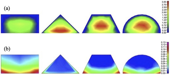 The distribution of (a) liquid water saturation and (b) flow velocity (m/s) in a channel for various cross-section shapes [47].