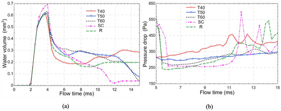 Variation of (a) the water content within control volume and (b) the two-phase pressure drop during the flow time of 5–15 ms for different channel cross-section geometries [48].