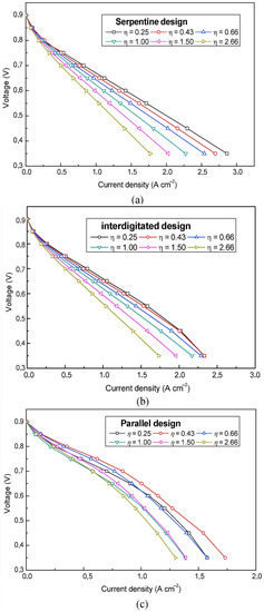 The polarization curve of PEMFC with different channel-to-rib width ratio in: (a) parallel; (b) serpentine; and (c) interdigitated flow field [51].
