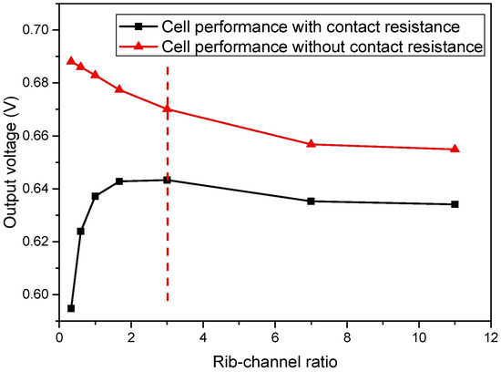 The performance of PEMFC with different channel-to-rib width ratio at a current density of 600 mA/cm [52].