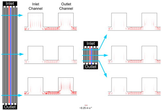 The cross-sectional views of cross flow velocity at positions of approximately 10%, 50%, and 90% of both long and short interdigitated flow channels [58].