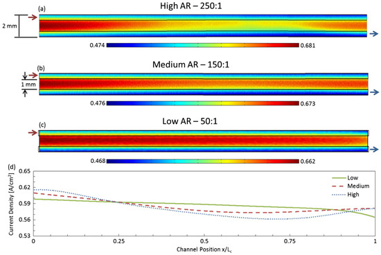 Increasing the length of the gas flow path allows convection to be the main way for fuel transport, with higher utilisation compared to diffusion gas. However, short length can contribute to more uniform electrochemical reactions and a reduction in water accumulation in the cell [56,57]. Santamaria et al. [58] simulated two different lengths of interdigitated flow fields using the MUMPS direct solver in COMSOL 4.3 (COMSOL Inc., Stockholm, Sweden), as seen in Figure 7. The results showed that the flow field design with a shorter length produced a higher maximum power. In the case of the longer flow channels, the flow distribution under the rib area (cross-flow) is affected by inhomogeneity, while the shorter case produces relatively uniform cross-flow along its length. The aspect ratio of the channel therefore has to be carefully set when designing the flow field. Cooper et al. [59] investigated the effect of aspect ratio on cell performance in interdigitated flow fields. It was shown in Figure 8 that a significant reduction in current density was observed in the central region of the interdigitated flow field for medium and high aspect ratios, while there is a more uniform current density distribution over the length of the flow field for low aspect ratios. The main cause of power density loss in the cell is the accumulation of liquid water in the flow channels. A low aspect ratio design should be adopted for the PEMFCs with interdigitated flow field or an additional design to remove liquid water if a high aspect ratio is required.