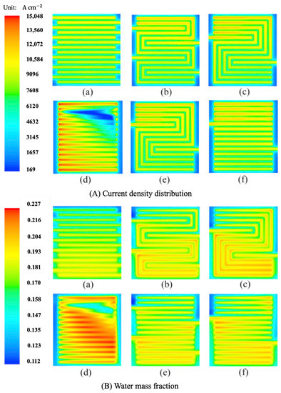 The distribution of (A) current density and (B) water mass fraction at the cathode of (a) 1S, (b) 3S, (c) 5S, (d) parallel, (e) 3PIS and (f) 5PIS [60].