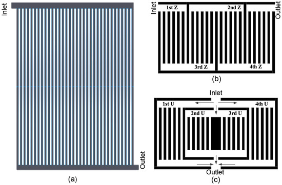 The geometry of the flow field: (a) conventional Z type; (b) multiple Z type; (c) optimized Z type [62].