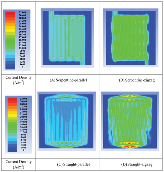 The current density distribution: (A) serpentine; (B) serpentine zigzag; (C) parallel; (D) parallel zigzag [65].