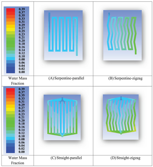 The water mass fraction distribution: (A) serpentine; (B) serpentine zigzag; (C) parallel; (D) parallel zigzag [65].
