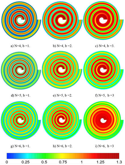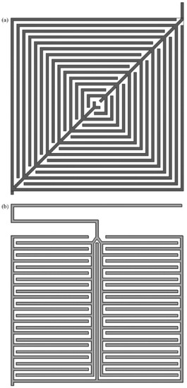 Monsaf et al. [68] designed a spiral flow field and investigated the effects of channel width, number of spiral channels, and direction of flow on reactant consumption in a proton exchange membrane fuel cell with such a flow field. The larger the channel to rib width ratio, the larger the contact area between the flow field and the gas diffusion layer, the more reactants penetrated the gas diffusion layer, and the more uniformly the reactants were distributed. The increase in the number of turns of the spiral channel improved the uniformity of the reactant distribution. As Figure 13 shows, when the reactants are injected from the outer side of the spiral flow field and discharged from its inner side, the spiral shape of the channel would generate centrifugal force, thus improving the cell performance. A honeycomb bionic flow field was proposed by Zhang et al. [69]. Compared to parallel and serpentine, a honeycomb flow field has been found to improve cell performance by distributing oxygen more uniformly across the GDL surface, but at the same time, moisture tends to accumulate inside the flow channel leading to flooding.
