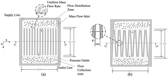 The structure and parameters of the inlet and outlet headers of the flow field have a significant effect on the distribution of reactants and liquid water. The results by Hossain et al. [62] for a Z-shaped parallel flow field suggest that decreasing the width of the distribution channel along the inlet increases the gas flow through the transverse channel in the middle of the flow field. In addition, a parallel flow field combining both Z- and U-shaped structures provides a better flow distribution. The geometry of the flow field used in this work is shown in Figure 10. Chen et al. [63] developed a two-dimensional model of the interdigitated flow field and simulated the effect of the width of the head channel at the outlet on the performance of a proton exchange membrane fuel cell. It was found that the PEMFC with narrower head channel width had a more uniform distribution of the amount of oxygen concentration in the cathode, better capacity for drainage, and superior overall performance than the conventional outlet. In the study conducted by Xiong et al. [64], the effect of different widths of the distribution channel at the inlet and the manifold at the outlet of the Z-parallel flow field on the oxygen concentration distribution at the cathode was investigated by simulation. The results show that if the flow rate at the inlet is the same, increasing the width of the manifold at the outlet is of benefit to the increase of the oxygen concentration at the cathode, and the oxygen distribution is more uniform, while increasing the width of the distribution channel at the inlet could disturb the uniformity of oxygen distribution. A tapering design for the inlet header with an appropriate distribution of flow channels can improve the oxygen concentration and oxygen distribution uniformity at the cathode.