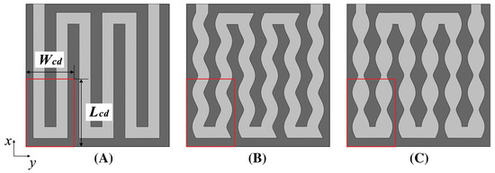 The serpentine flow field with (A) straight wall; (B) parallel wavy wall; (C) symmetrical wavy wall [74].