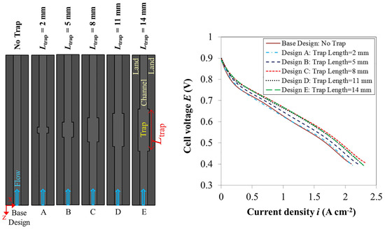 Study of the effect of traps and their lengths on the cell performance: the left picture shows (mono-trap or single-trap) channels with the different trap lengths of 2, 5, 8, 11, and 14 mm, here named as Cases or Designs A, B, C, D, and E, respectively, and the simple straight (conventional) channel called the base design (the channel with no trap). The shown graph compares the polarization curves for these PEMFC Designs A to E and a PEMFC with no-trap straight (conventional) channel (base design) [75].