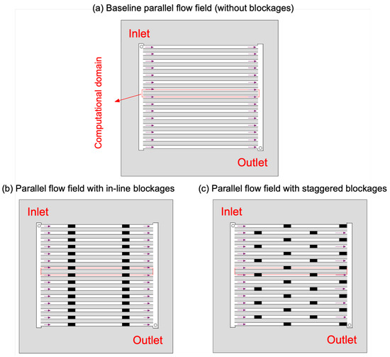 The schematic diagrams for the two novel flow fields at cathode of PEMFC investigated. The anode flow fields are conventional (parallel without blockages as shown in (a)) [76].