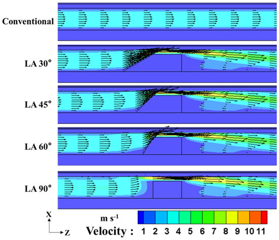 Ghanbarian et al. [79] investigated the enhancement of the performance of PEMFCs with different shapes and distribution of baffles in the flow channel. It was found that the baffles resulted in a more uniform oxygen content in the catalyst layer due to a synergistic effect caused by diffusion and convection. The most significant improvement in net cell power density was obtained when the baffle shape was trapezoidal with a height of of the channel height. Yin et al. [80] observed that trapezoidal baffles significantly increased convective flux but also reduced the diffusive flux of oxygen in the gas diffusion layer near the baffle location. The optimum forward and backward inclination angles of the trapezoidal baffle were both , which balanced the strength of the convective effect and its effect area and eliminated the backflow phenomenon, thus maintaining efficient mass transfer (Figure 21). A more detailed study of baffle height by Yin et al. [81] concluded that the net power of the fuel cell is maximised when the baffle height is 0.8 times the channel height, and the optimum number of baffles along the channel is 5. Chen et al. [82] added porous media blocks in addition to the baffles to further increase the flow resistance from the inlet to the outlet in the flow field. The reactants were forced to transfer into the porous blocks and the gas diffusion layer, thus improving the cell performance. The low porosity of the porous blocks helped to remove the liquid water from the gas diffusion layer more effectively, contributing to a significant improvement in cell performance.