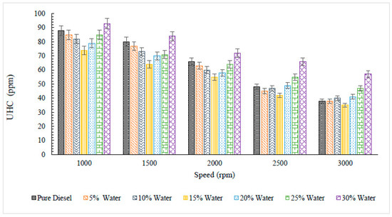 - According to the experimental analysis, the highest reductions in UHC and CO were 15.63% and 9.57%, respectively, at 15% water addition compared to pure diesel. The reduction in UHC and CO emissions was due to the consequence of a micro-explosion process that might result in total combustion.