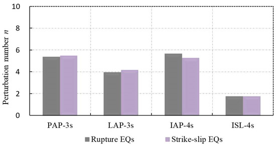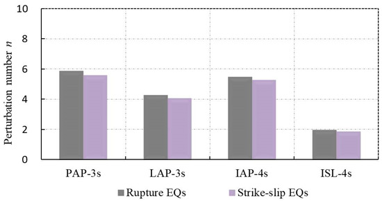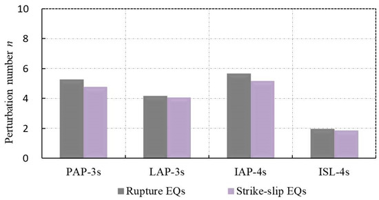 Histogram of averaged perturbation number n derived from different datasets of PAP-3s, LAP-3s, IAP-4s, and ISL-4s for different types of real EQs: rupture EQs (light grey bar) and strike-slip EQs (light purple bar).
