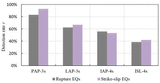 Histogram of the detection rate r derived from different datasets of PAP-3s, LAP-3s, IAP-4s, and ISL-4s for different types of randomly generated EQs: rupture EQs (light grey bar) and strike-slip EQs (light purple bar).