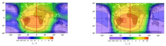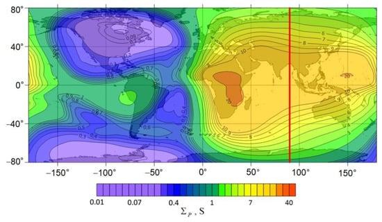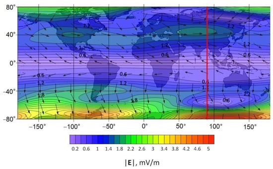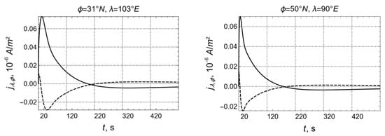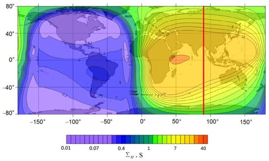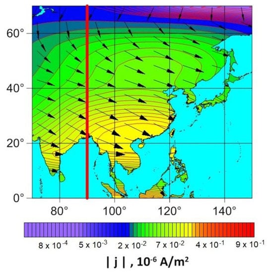 The calculations were made for the following parameter values: date—19 June 2020, time—06:00 UT (longitude of the subsolar meridian 90°), height of the conducting layer of the ionosphere is 120 km, time-integrated flare energy flux density is 0.005 J/m